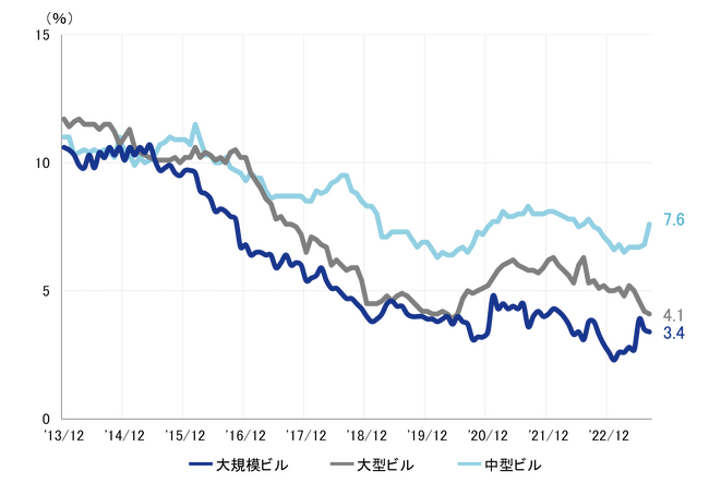規模別 空室率:「中型」大幅に上昇し、9ヵ月ぶりに7%台へ