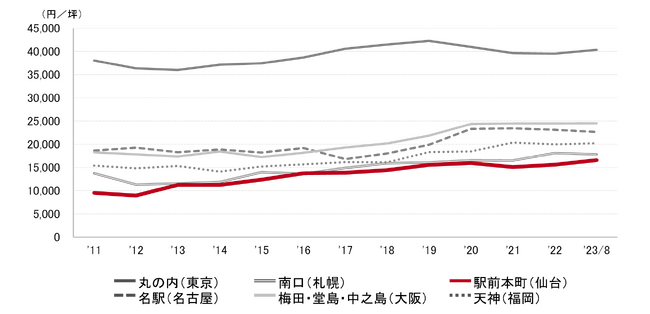 三幸エステート株式会社(本社:東京都中央区、取締役社長:武井重夫)は、2023年8月度の仙台市オフィス賃貸状況(空室率&現空面積:全規模、募集賃料&募集面積:全規模、規模別空室率、主要エリア※1空室率:全規模)および全国6大都市(東京・札幌・仙台・名古屋・大阪・福岡)の大規模ビルのマーケットデータをまとめた 「オフィスマーケット2023年9月号 仙台」を公表します。
