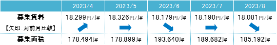 募集賃料は前月比マイナス109円/坪の18,081円/坪となった。2ヵ月ぶりに下落したものの比較的小幅な動きであり、18,000円/坪台前半での横ばい傾向にある。