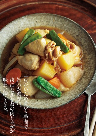 肉じゃがをむね肉でつくる鶏肉じゃが。肉に粉をはたけばパサつかずしっとり。身からはいだ皮を細切りにしていためるひと手間で旨みが濃厚になり、淡泊な鶏むねの肉じゃがを味わい深く。