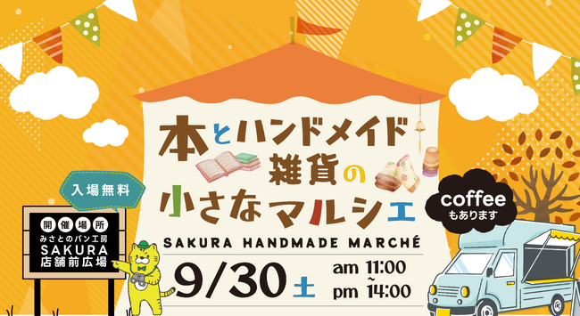 9月30日(土)埼玉県三郷市にて『本とハンドメイド雑貨の小さなマルシェ~SAKURA HANDMADE MARCHE』を開催します。本年は「日本一の読書のまち宣言」から10周年の記念の年となります。このイベントでは、本とクリエイターによるハンドメイド雑貨が一堂に集まり、地域の人々が交流できる場所として皆様にもお楽しみいただけます。