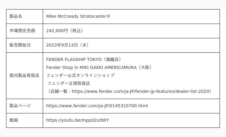 「マイクとこのように継続してパートナーシップを組み、彼のシグネイチャーストラトキャスターをより多くのプレイヤーとファンにお届けできることを大変嬉しく思います。マイクが与える影響は、紛れもなく過去と現代のロックミュージックのサウンドを形成しており、このシグネイチャーギターは、フェンダーがその歴史を通して掲げてきたクラフトマンシップの精神を体現しています。ヴィンテージで使い込まれたようなルックスや存在感のあるサウンドに個々のモダンタッチを自由に加えられるカスタムピックピックアップセットといった特徴は、多くのプレイヤーに喜ばれるでしょう。」