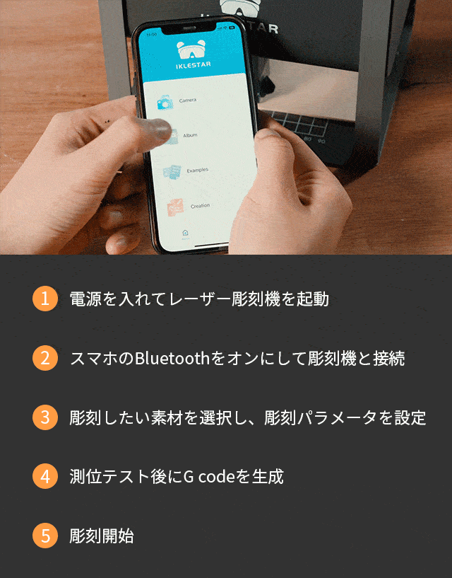 電源を入れてアプリと接続、アプリ内のパターンを選択または写真をアップロードするだけで彫刻可能なので、初心者でも簡単に操作することができます。