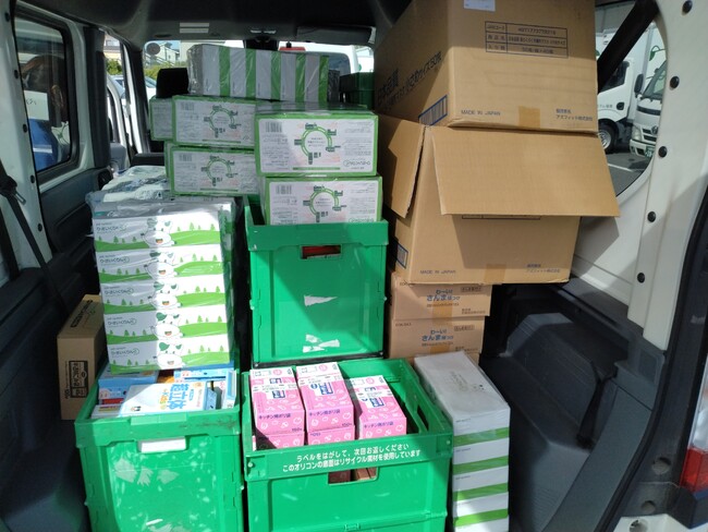 支援物資は、災害用の備蓄品で、飲料水や非常食、トイレットペーパーやマスクなど、緊急時に活用できる物資です。スタッフが配送トラックに追従して運搬し、必要に応じて提供しています。訪問時に相対できた利用者からは、「パルシステムを続けていてよかった」「本当にありがたい、感謝します」など声をかけられ、なかには涙をこぼす方もいました。