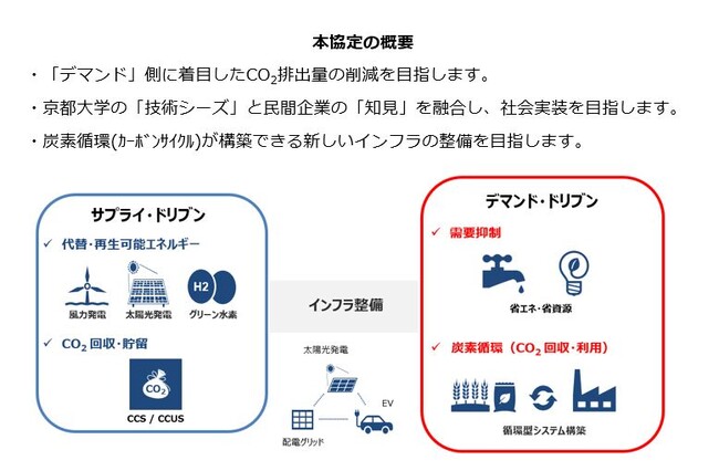 本協定は、産官学連携体制で大学の技術や知をカーボンニュートラルの実現に向けたビジネスや産業に還元することを目的として、革新的な技術や知を有する京都大学、社会課題解決に向けたビジョン策定から共創の場の創出までを行う日本総研、そして大学の知の社会への橋渡しを推進する京大オリジナルの三者が連携するものです。また、将来の新たな課題に対して、機動的に対応していくためのプロセスづくりについても検討します。