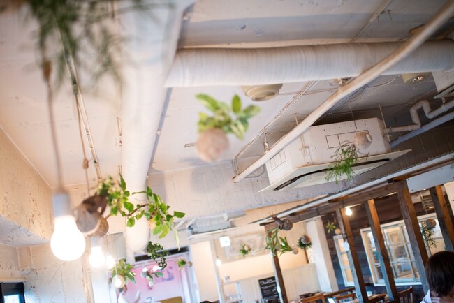 「A to Z cafe」では、現在、9月26日(火)までの期間、その不思議な浮遊感と、可愛らしさと格好良さを併せ持った風情が魅力のハングボールの数々を店内に飾り、お食事とともにお楽しみいただく「hang空中植物園」を開催しています。