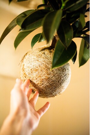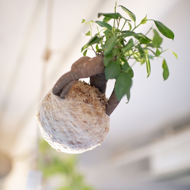 枝ぶりや葉の生え方など、各々の植物の個性を見極めながら、その根を丸いかたちに包み込み、できあがったボールに応じてフックを取り付け、天井から吊るして楽しみます。もちろん、すべて手作り。