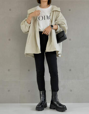 ヒップ周りを隠すややオーバーなサイズ感で、こなれたシルエットをメイクしつつ、さりげなく体型カバーも叶えます。