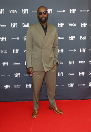ラジ・リは、カーキのダブルブレストピークドラペルスーツにブラックシャツを合わせた装いで登場。