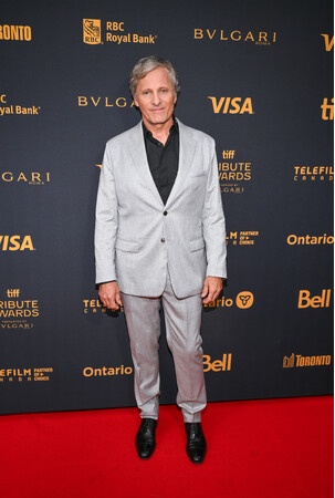 ヴィゴ・モーテンセンは、ライトグレーのノッチラペルスーツにクラシックなブラックシャツをコーディネート。
