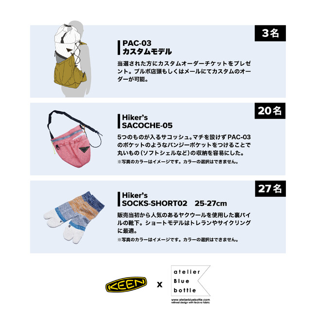 完売が続くほど大人気のバックパックやサコッシュに加え、ハイカーから支持の高い足袋モチーフのソックスが賞品に並びました。まだ残暑が続きますが、登山やキャンプが気持ちいい秋に向けて今回のコラボレーションシューズをご購入頂き、ぜひ本キャンペーンにご参加ください。