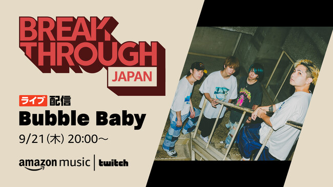 Amazon Musicは、次世代のミュージックシーンを担う選りすぐりのアーティストが出演するライブイベント「BREAKTHROUGH JAPAN Live」を、9月21日(木)20:00からTwitch上のAmazon Music Japanチャンネルにて生配信します。第6回目となる今回は、沖縄にて結成された4ピース・バンドBubble Babyが出演します。