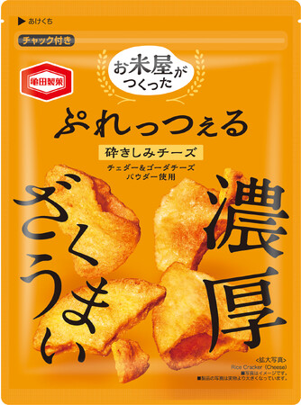 『お米屋がつくった ぷれっつぇるチーズ』は、独自の米菓製法を用いて、中までたっぷりと味をしみ込ませた濃厚な味わいとザクザク食感の「ぷれっつぇる」です。焼き上げた堅焼せんべいをあえて細かく不揃いに砕き、砕いた生地をチェダーチーズとゴーダチーズをベースにした濃厚チーズソースの中へどっぷりと漬け込むことで、生地の断面や空洞の中にまでたっぷりと味がしみ込んだ驚きの濃厚感を実現しました。ザクザクとした食べ心地でとまらない美味しさです。