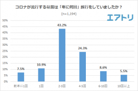 コロナ禍以前、年間で旅行に行っていた回数は、「2-3回」(43.2%)が最多回答でした。次いで、「4-5回」(24.3%)、「1回」(10.9%)となりました。