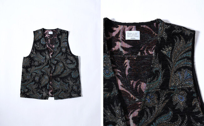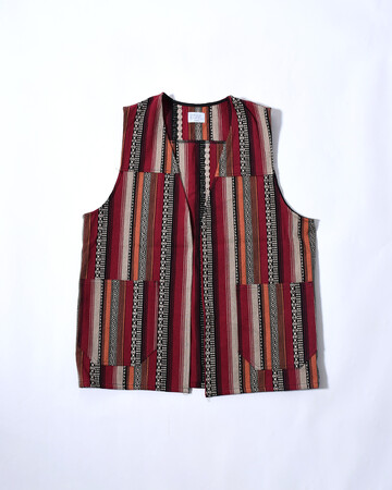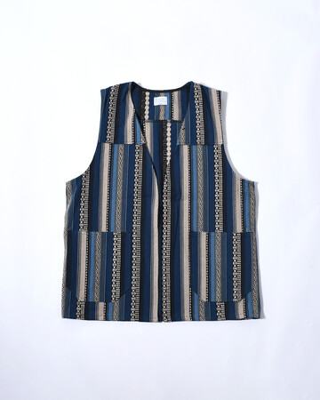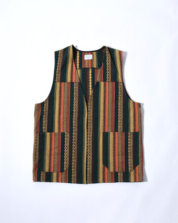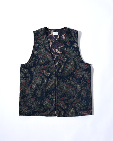 立体感のある織生地を使用したベスト。ヴィンテージライクなデザインと深い色合いで、スタイリングのアクセントとしても重宝します。程よくカジュアルな生地感のため、テーラードジャケットとはもちろんデニムジャケットの下に入れるのもおすすめです。