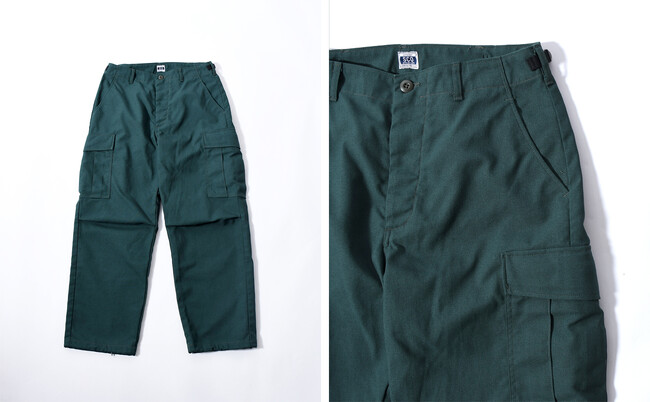 数あるミリタリーカーゴパンツの中でも注目されてきているジャングルファティーグパンツのサードタイプがモチーフ。カーゴポケットには使い込んだような膨らみを出し、古着のような佇まいに。左カーゴポケットの中にはインナーポケットもあり本格的な仕様。通常ミリタリーアイテムでは見られないカラーリングのアンマッチさが魅力。