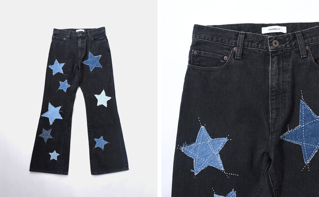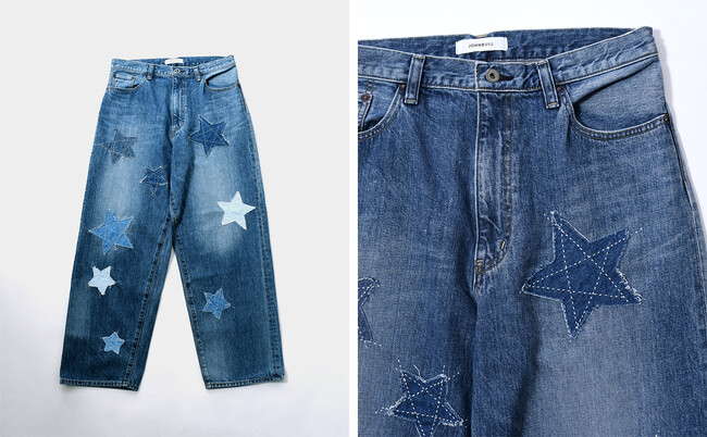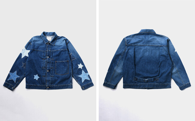 アソートのデニム生地であしらわれた大小さまざまな星が目を引くデニムジャケット。
