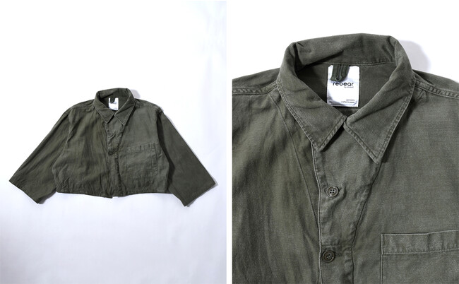 ヴィンテージアイテムを使用することで、ひとつひとつ異なる風合いとデザインに。ジャケットはトレンド感のあるショート丈になっており、シャツジャケットとしてスラックスやデニムと合わせても。長く着用されたアイテム特有の雰囲気をそのままに、今着たいアイテムへとアップデートしています。