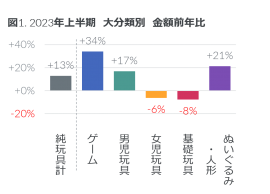 ・2023年上半期の玩具販売額は前年比13%増。2022年に引き続きトレーディングカードの販売が大きく伸びた大分類「ゲーム」が市場拡大をけん引。「男児玩具」「ぬいぐるみ・人形」も金額増加に貢献。