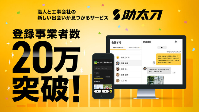 職人と工事会社の新しい出会いが見つかるアプリ「助太刀」、登録ユーザー数が20万事業者を突破!