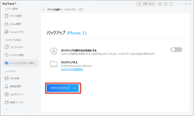 Step4、次の画面で「パスワード保護を有効にする」をオンにして、もう一度「今すぐバックアップ」をすれば、LINEのデータのバックアップが開始されます。完了したら、AnyTransでバックアップされたデータを確認することができます。
