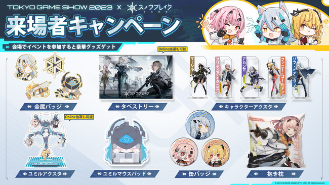 ゲームショウの会場に行けない方のために、Twitter(現・X)を使った抽選キャンペーンを実施いたします。自宅からでも気軽に応募することができ、抽選で選ばれた方にタペストリー&ユミルのアクスタをお贈りいたします。参加方法は、公式ツイートをリツイートし、さらに「#スノブレ #TGS2023」のタグをつけてコメントするだけです。抽選日は、後日発表いたします。
