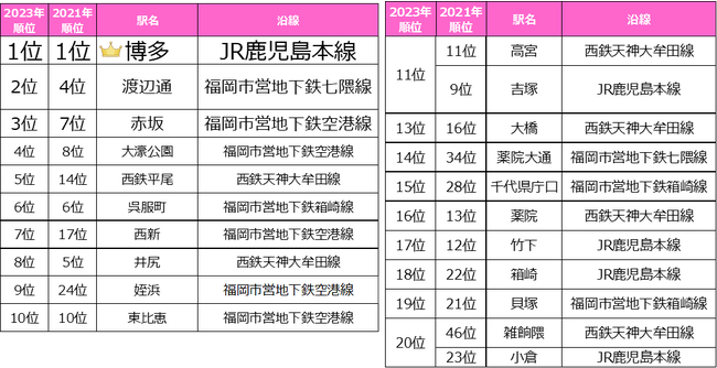 ・「西鉄平尾」「西新」「姪浜」は、2021年度のランキングからジャンプアップしTOP10入り
