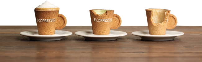 熱いエスプレッソを注いでも崩れない、グルテンフリーのクッキーからできているコーヒーカップ。飲み終わった後にカップをおいしく食べて片付けられる、新しい環境配慮アイテムです。 社名:テンセンス