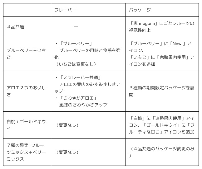 このたび、「ブルーベリー+いちご」と「アロエ2つのおいしさ」の中身のリニューアルを実施します。