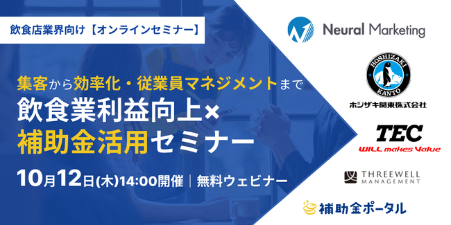 10月12日、株式会社補助金ポータル(本社:東京都渋谷区、代表取締役 福井彰次)は、ニューラルマーケティング株式会社(本社:東京都品川区、代表取締役 山本正晃氏)、ホシザキ関東株式会社(本社:東京都文京区、代表取締役社長 今野浩治氏)、東芝テック株式会社(本社:東京都品川区、代表取締役社長 錦織弘信氏)、株式会社スリーウェルマネジメント(本社:東京都中央区、代表 三ツ井創太郎氏)と共に、「集客から効率化、そして従業員マネジメントまで 飲食業利益向上×補助金活用セミナー」を開催いたします。
