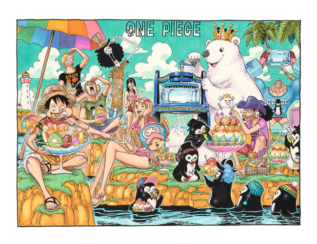 氷のフレークになって落ちる「ONE PIECE」の「O」の字。フルーツいっぱいの、誰よりも大きなかき氷を食べるルフィ。楽しげなナミとチョッパー。にぎやかで涼しげな作品である。