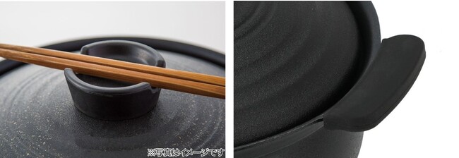 色はブラックとアイボリーの2色展開で、全6サイズ取り揃えています。鍋の内側はダイヤモンドコーティングを施しており、食材がこびりつきにくく、お手入れも簡単。さらに、ふたのつまみに菜箸を一時置きできたり、シリコーンカバー付きで加熱後すぐに持ち運びできたり、使い勝手抜群です。