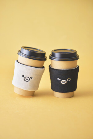 柔らかい手触りのカップ用スリーブです。マジックテープでサイズ調節ができます。リバーシブルで、表も裏もかわいいフェイス柄です。