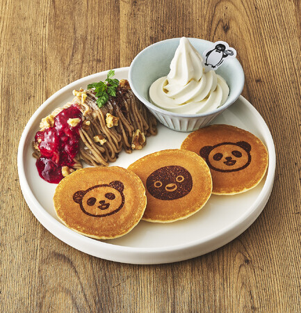 Suicaのペンギンとパンダのかわいさが際立つパンケーキを、マロンクリームと合わせてモンブラン風のパンケーキに仕立てました。