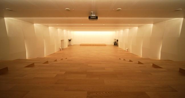 ・舞台と客席を備えた、広さ約350平方メートル の中規模多目的ホールで、舞台には280インチのスクリーンと、9,000~15,000ルーメンのプロジェクターを設置しています。セミナーやコンサートなど、多目的に利用できるホールです。