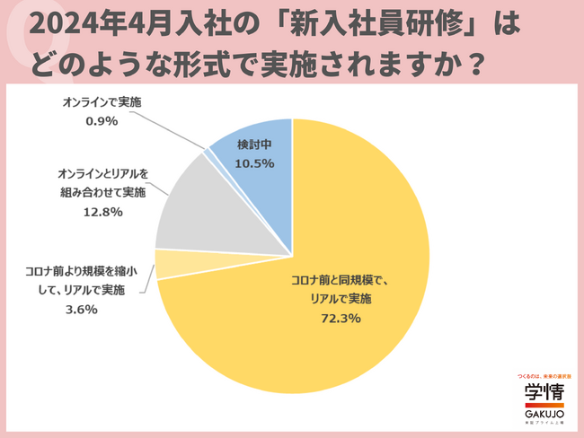 2024年4月入社の「新入社員研修」の実施形式は、「コロナ前と同規模で、リアルで実施」が72.3%で最多。次いで、「オンラインとリアルを組み合わせて実施」12.8%が続きました。「オンラインでも実施できる内容ではあるものの、リアルで実施したほうが同期同士のつながりが生まれると思う」「リアルのほうが、新入社員の理解度を確認しながら研修を進めることができる」「基本出社ではあるものの、Web商談やリモートワークの機会もあるので、リアルとオンライン両方のコミュニケーションに慣れて欲しい」といった声が上がりました。