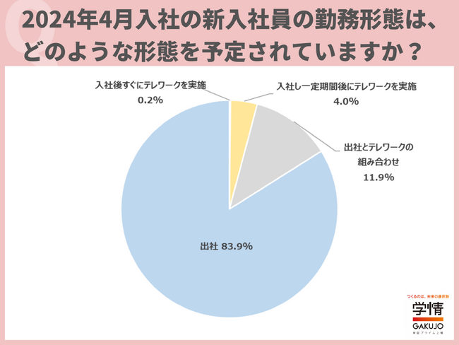 株式会社学情(本社:東京都千代田区)は、企業・団体の人事担当者を対象に、インターネットアンケートを実施。今回は、「新入社員の勤務形態・新入社員研修の形式」に関して調査しました。2024年4月入社の新入社員の勤務形態は、「出社」が83.9%で最多。次いで、「出社とテレワークの組み合わせ」11.9%が続きました。「仕事を覚えるタイミングでは、出社のほうが適していると思う」「入社直後にテレワークは難しいと思う」「ゆくゆくテレワークも併用した勤務形態に移行するが、入社直後は出社して仕事を覚えてもらう予定」といった声が寄せられています。2024年4月入社の「新入社員研修」の実施形式は、「コロナ前と同規模で、リアルで実施」が72.3%で最多。次いで、「オンラインとリアルを組み合わせて実施」12.8%が続きました。「オンラインでも実施できる内容ではあるものの、リアルで実施したほうが同期同士のつながりが生まれると思う」という声が上がりました。
