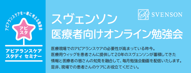 スヴェンソングループの株式会社スヴェンソン(本社:東京都港区、代表取締役社長 児玉義則)レディス事業部は、医療従事者向けのオンライン勉強会「アピアランスケア スタディ セミナー(アピスタ)」を2023年10月~2023年12月まで開催し、テーマに合わせた15分の動画を毎月配信いたします。