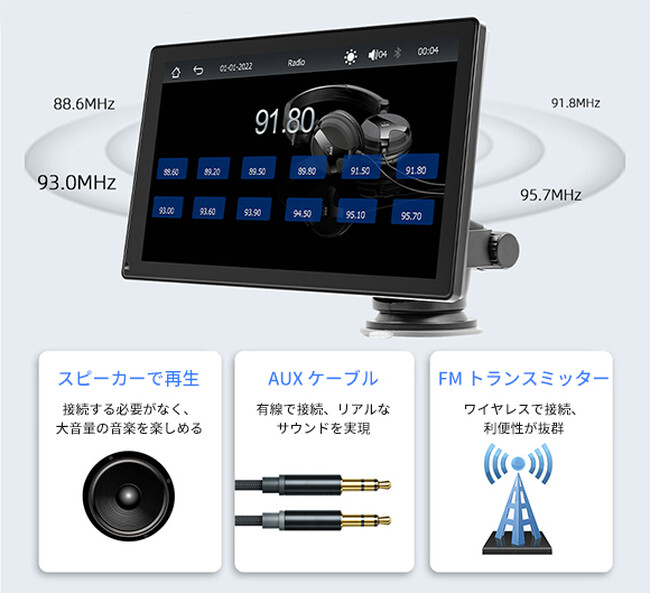 FMトランスミッターを使ったワイヤレス接続、もしくはAUXケーブルを使った有線接続の2種類の接続方法で、カースピーカーと組み合わせて使用することが可能です。