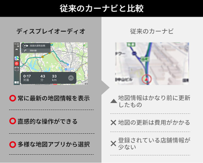 従来のカーナビでは地図の情報が古かったり、登録されている施設や店舗情報の数が少なく、目的地にたどり着くのに苦労したことはありませんか?