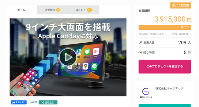 株式会社ギャザテックは、2023年7月28日よりディスプレイオーディオ「TENKEN B53」のクラウドファンディングプロジェクトを、GREEN FUNDINGにて開始いたしました。