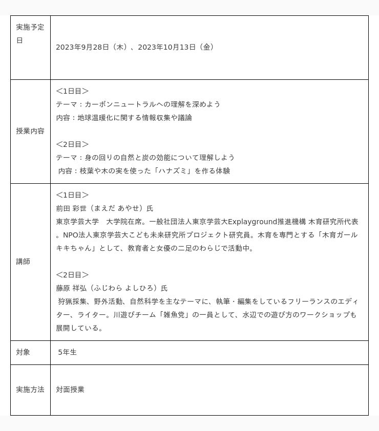 小金井第四小学校で行われる「総合的な学習の時間」では、地球温暖化の原因となるCO2について理解を深める授業と、「WILD MIND GO! GO!」で人気の「ハナズミ(花炭)」を作る自然体験を行います。