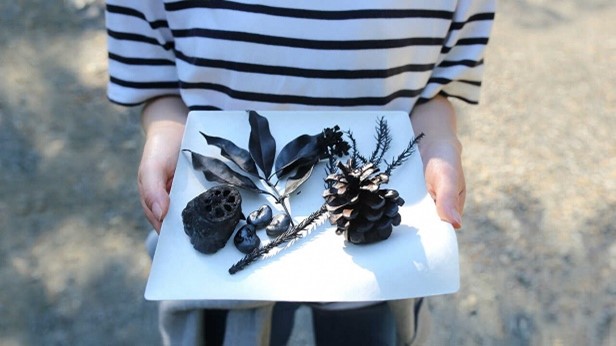 ハナズミとは、木の実や果実などを、穴の開いた容器や箱に入れ加熱し、植物の水分と栄養分を蒸発させることで、植物の形を保ったままできる炭のことを指します。「飾り炭」とも言われ、自然の造形美を鑑賞できると同時に除湿や防臭作用も期待できます。それに加え、植物が光合成の働きにより吸収したCO2を炭の中に閉じ込める効果もあります。