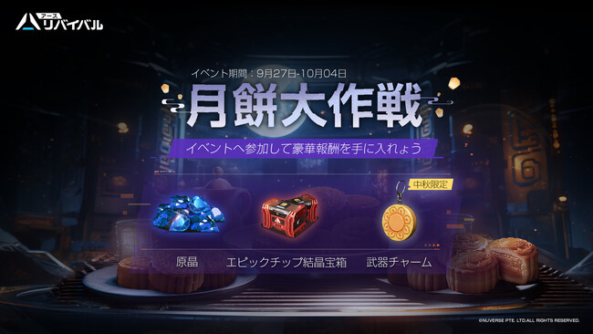 内容:期間中に毎日ドロップする専用素材を使用して、プレイヤーは家庭用調理台で月餅を作ることができます。甘い味と塩辛い味の2種類の月餅を作ることができ、どちらかの味の陣営に所属できます。どちらかの陣営に所属すると、陣営の“称号”が報酬としてプレゼントされるほか、期間中により多く制作された味の陣営に所属していたプレイヤーには「エピックチップ結晶」×2、「連盟ポイント」×200000をプレゼント!また関連する4つのクエストを全て完了すると、中秋限定の武器チャーム「蓉月」を獲得できます。
