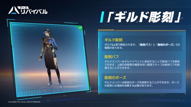 プレイヤーの戦闘を後押しする新システム「バトルスーツレンタル」およびギルドの新システム「ギルド彫刻」を実装。「バトルスーツレンタル」は、その名の通りバトルスーツを一定期間レンタルできるので、まだ手に入れていないバトルスーツで戦闘に参加することができます。「ギルド彫刻」は、ギルドの会長の彫刻をギルド内に建てることができます。ギルド彫刻にはバフの設定ができるうえ、ポーズの変更や「いいね」もできます。また、既存システムの「武器特化」もアップグレード。特殊特化に新たな一行が追加され、プレイヤーの能力向上を後押しします。