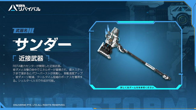 内容:REFA動力センターが開発した新しい近接武器「サンダー」が登場いたします。ダメージを受けたときや攻撃が命中したときにエネルギーが蓄積されていき、最大スタックまで溜まるとパワーバーストが発動し、移動速度アップ、被ダメージ軽減、クールタイム短縮のボーナスを獲得。コア部分には希少な合金が使用されているため、振りかざしたときの威力は十分です。シェルターLV.6で作成が可能となります。