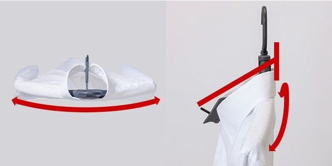 襟元ピンチのレバーを引いて、ロックを解除します。次に、襟元部のワンタッチボタンでアームが収納され、取り込み完了です。
