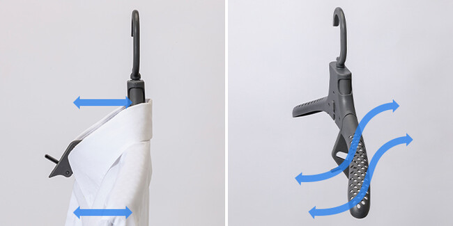 ピンチによる襟元のスペースと、幅広肩の通気孔により風が通りやすく、洗濯物が乾きやすい構造です。