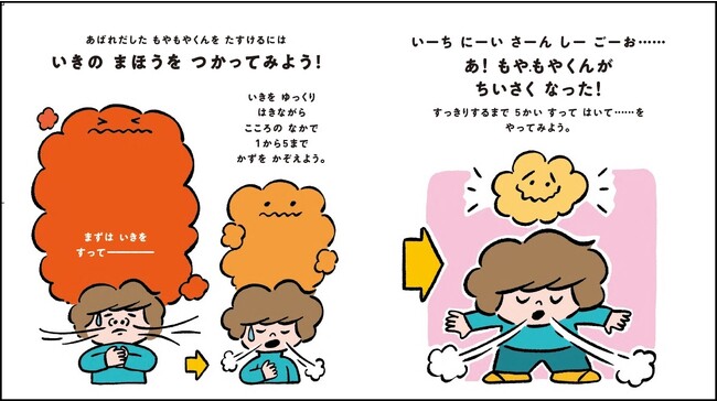 絵本では“いきのまほう”と表現。ゆっくり深呼吸することで感情の高まりを鎮めることができます。