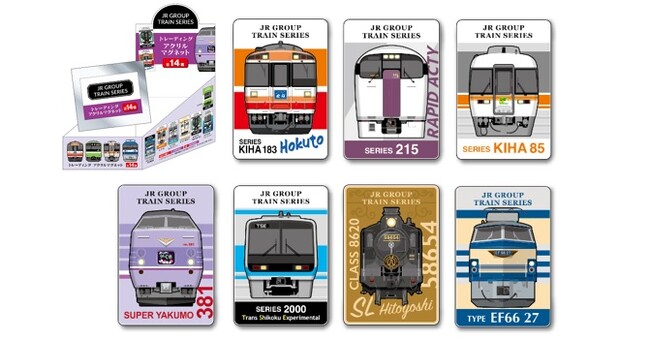 JR7社の新旧人気車両の描き下ろしイラストがデザインされたアクリルマグネット。 7社×各2車両の全14種がランダムに封入されています。1BOX(※)購入でコンプリートできます。